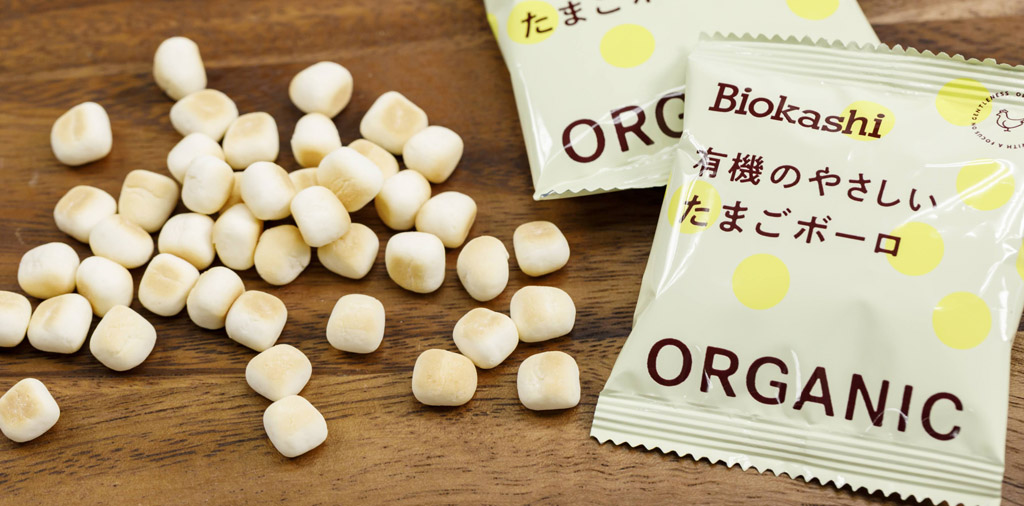 Biokashi(ビオカシ)は「有機のやさしいたまごボーロ」を新発売。やさしさの3つの理由は「有機馬鈴薯でんぷん」「有機たまご」「有機米飴」。これらの素材を揃えるだけでも難しく、商品化にはとても苦労しました。希少な有機素材を丁寧に焼き上げ、手間をかけて良質に仕上げています。赤ちゃんから大人まで、誰にでも愛される有機のお菓子をぜひ、お試しください。